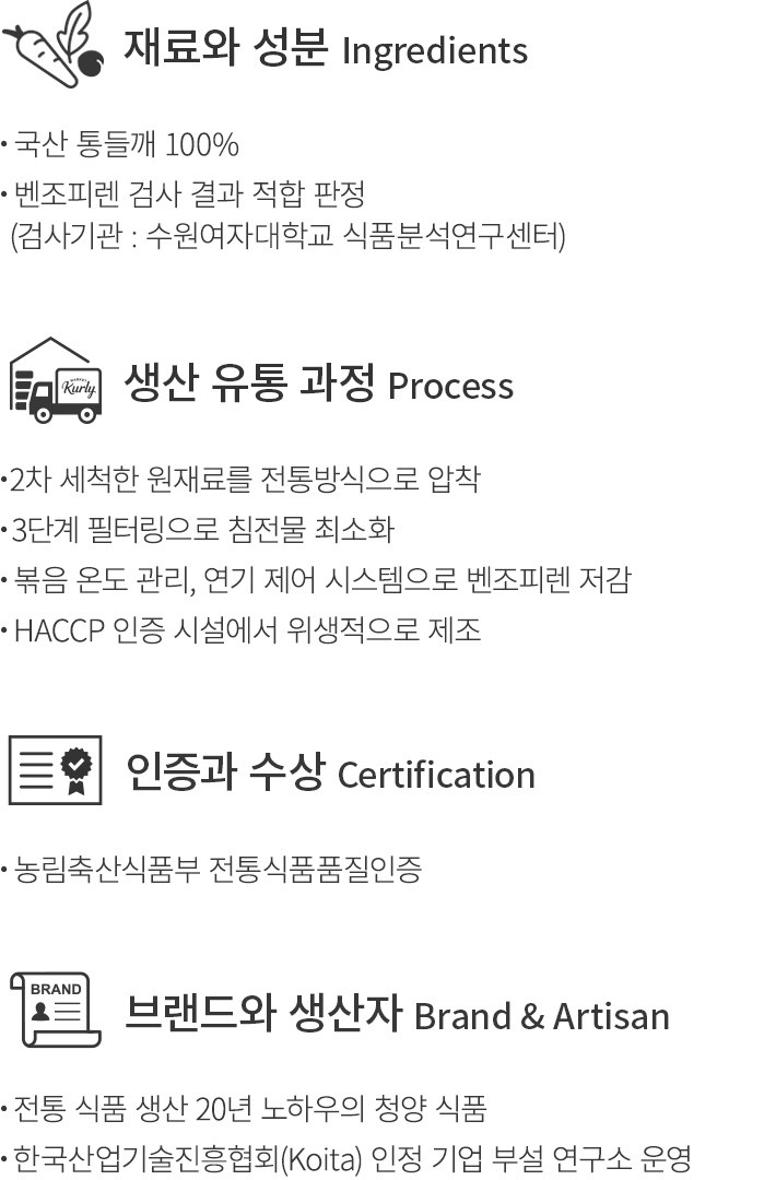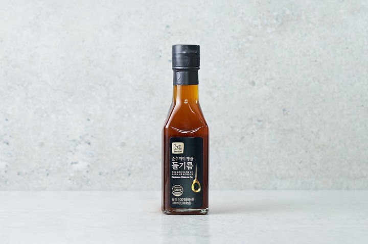 들기름의 맛과 향 그리고 색은 원재료,볶는 온도,정제 횟수에 따라 달라져요. 꼬손의 들기름은 깨를 볶은 후 빻은 들깨분이 아닌 원물 그대로의 국산 통들깨를 볶은 후 재래식으로 압착해 이름처럼 고소한 맛과 향을 자랑하지요. 착유 후에는 3단계 필터링으로 침전물이 적어 기름 자체가 맑고 깔끔해요. 게다가 수입 들기름과 생산 설비부터 분리되어 있어서 더욱 믿을 수 있어요. 너무 많지도 적지도 않게,개봉 후 신선하게 드실 수 있는 180ml 용량으로 제안해드려요.