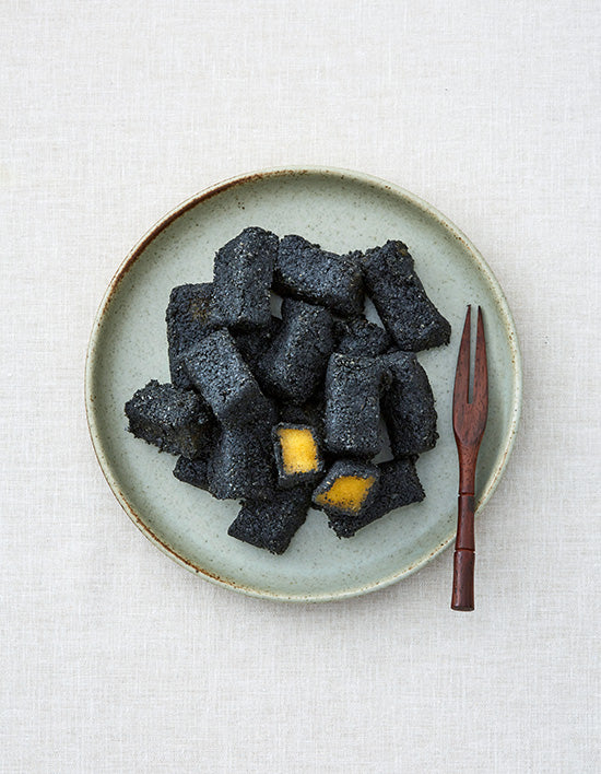 ?특징 :국내산 찹쌀가루로 만든 단호박 인절미를 한입 크기로 자른 후,고소한 흑임자 고물을 묻힌 떡입니다.