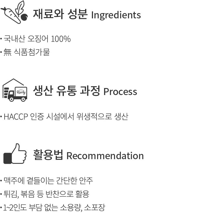 ・특징:꼬들꼬들한 식감과 담백한 맛이 잘 살아 있는 국내산 반건조 오징어예요. 씹을수록 부드러워 편안하게 즐기기 좋아요.