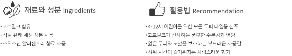 ・ 특징:고트밀크를 함유해 보습감이 풍부한 4~12세용 키즈 샴푸입니다. 두피 타입과 관계없이 사용할 수 있어요.