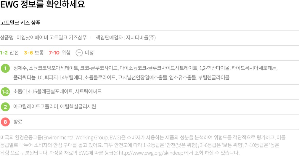 EWG에 대한 컬리의 생각 컬리는 화장품,샴푸,치약,세제 등 우리의 인체에 닿는 리빙 제품의 전성분을 공개하고 성분의 위험 정도를 EWG 기준에 따라 1~10 숫자로 안내하고 있습니다. EWG가 세계적으로 널리 사용되는 신뢰할 수 있는 척도인 것은 맞지만,상품의 안전성을 증명하는 절대적인 기준은 아니에요. EWG로부터 좋지 못한 평가를 받은 성분에 대해 전문가와 유관기관은 '권고 기준치를 지켜 사용할 경우 무해하다'고 평가하기도 합니다. 이에 컬리는 EWG 등급과 인터넷에 떠도는 단편적인 정보에만 의존하지 않고 식품의약품안전처,에코서트(ECOCERT),미국식품의약국(FDA),미국화장품원료검토위원회(CIR)등 공신력 있는 인증기관의 의견을 참고하여 유해성 여부를 꼼꼼하게 따져 보고 있습니다.
