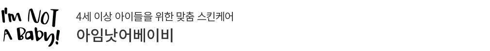 4세 이상의 아이들은 '난 이제 아기가 아니야!' 생각하며 베이비 제품은 쓰지 않으려 하지만,어른용 스킨케어를 쓰기엔 아직 여린 피부를 지녔지요. 이런 아이들에 대한 고민 끝에,아임낫어베이비는 4세부터 12세의 성장기 친구들을 위한 브랜드로 탄생했습니다. 아이들의 선호와 피부 안전성을 모두 아우르는 샴푸,린스,선케어 등 다양한 제품을 마련했고요. 동물 실험을 적극 반대하며 자연 유래 성분 위주의 제품 완성을 위해 연구를 거듭하고 있답니다. 성장기 아이들의 피부 고민에 꼭 맞는 맞춤 케어 제품들을 만나보세요.