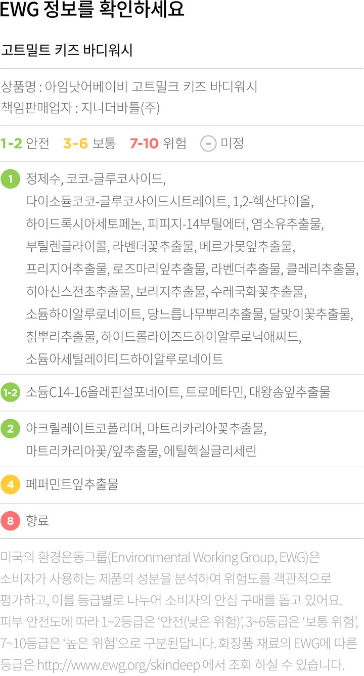 EWG에 대한 컬리의 생각 컬리는 화장품,샴푸,치약,세제 등 우리의 인체에 닿는 리빙 제품의 전성분을 공개하고 성분의 위험 정도를 EWG 기준에 따라 1~10 숫자로 안내하고 있습니다. EWG가 세계적으로 널리 사용되는 신뢰할 수 있는 척도인 것은 맞지만,상품의 안전성을 증명하는 절대적인 기준은 아니에요. EWG로부터 좋지 못한 평가를 받은 성분에 대해 전문가와 유관기관은 '권고 기준치를 지켜 사용할 경우 무해하다'고 평가하기도 합니다. 이에 컬리는 EWG 등급과 인터넷에 떠도는 단편적인 정보에만 의존하지 않고 식품의약품안전처,에코서트(ECOCERT),미국식품의약국(FDA),미국화장품원료검토위원회(CIR)등 공신력 있는 인증기관의 의견을 참고하여 유해성 여부를 꼼꼼하게 따져 보고 있습니다.