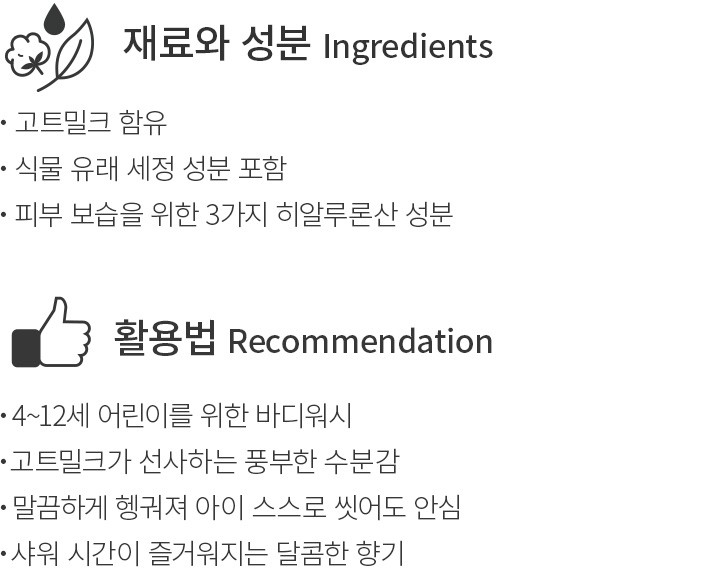 ・특징:4~12세 어린이용 바디워시입니다. 보습감이 풍부한 고트밀크를 함유해 샤워 후에도 피부에 촉촉함을 남겨줘요.