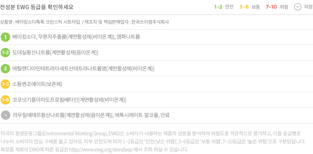EWG에 대한 컬리의 생각 컬리는 화장품,샴푸,치약,세제 등 우리의 인체에 닿는 리빙 제품의 전성분을 공개하고 성분의 위험 정도를 EWG 기준에 따라 1~10 숫자로 안내하고 있습니다. EWG가 세계적으로 널리 사용되는 신뢰할 수 있는 척도인 것은 맞지만,상품의 안전성을 증명하는 절대적인 기준은 아니에요. EWG로부터 좋지 못한 평가를 받은 성분에 대해 전문가와 유관기관은 '권고 기준치를 지켜 사용할 경우 무해하다'고 평가하기도 합니다. 이에 컬리는 EWG 등급과 인터넷에 떠도는 단편적인 정보에만 의존하지 않고 식품의약품안전처,에코서트(ECOCERT),미국식품의약국(FDA),미국화장품원료검토위원회(CIR)등 공신력 있는 인증기관의 의견을 참고하여 유해성 여부를 꼼꼼하게 따져 보고 있습니다.