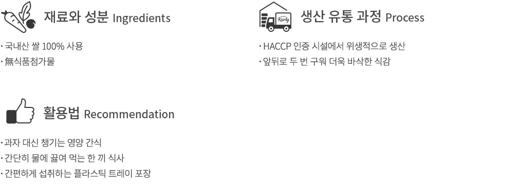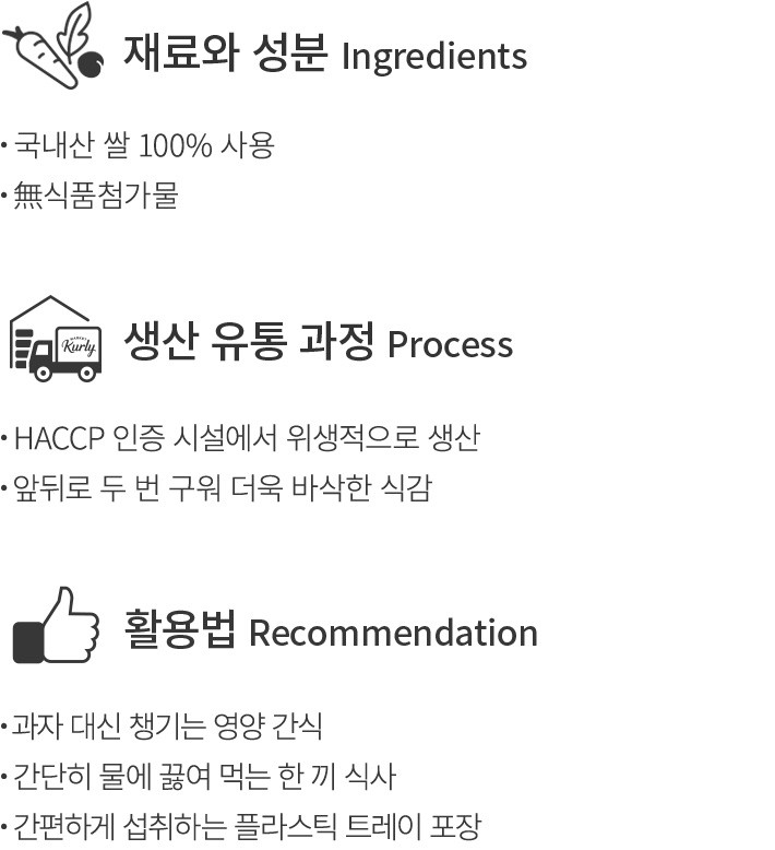 ・특징:앞 뒤로 두 번 구워 한층 더 바삭하게 즐길 수 있는 누룽지예요. 플라스틱 트레이에 담겨져 있어 한 켠에 두고 쏙쏙 집어 먹기에도 알맞답니다.