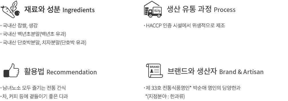 파삭파삭 부서지는 식감과 은은하게 전해지는 달콤함이 매력적인 유과. 박순애 전통 식품 명인의 한과 제조 노하우를 그대로 담은 전통 유과를 만나 보세요. 국내산 찹쌀과 쌀로 건강하게 만든 찹쌀유과부터 국내산 분말로 색을 입힌 백년초유과,단호박유과까지. 알록달록 빛깔마저 고운 세 가지 유과를 함께 담았어요. 고소하면서도 담백해 아이부터 어른까지 누구나 부담 없이 즐기기 좋고요. 간단한 다과상을 내기에도 참 좋을 거예요.