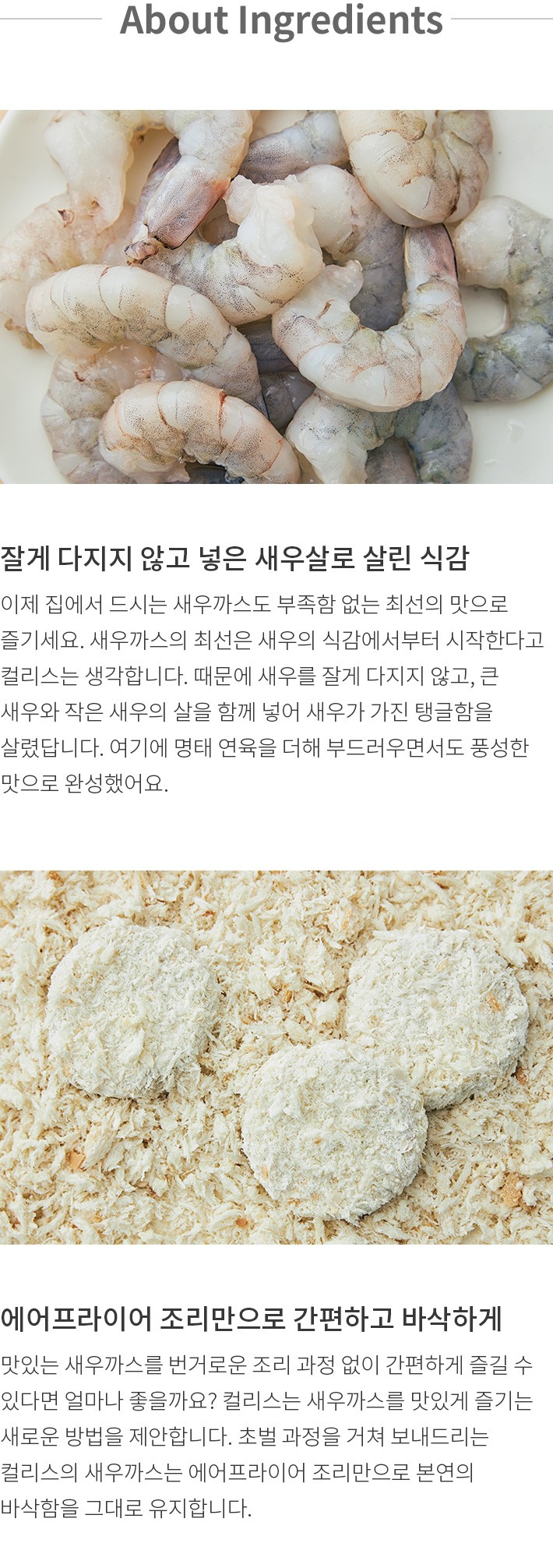 이제,돈까스에 이어 컬리스가 새우까스를 새롭게 선보입니다. 새우까스를 만들면서 가장 중요하게 생각했던 점은 역시 입안에서 바스러지지 않고 탱글하게 살아있는 새우의 식감이었습니다. 새우살을 잘게 다지지 않고,명태 연육을 더해 부드러우면서도 씹는 맛을 잃지 않도록 했어요. 아이들을 위한 간식이나 반찬은 물론,간단한 안주로도 추천한답니다.