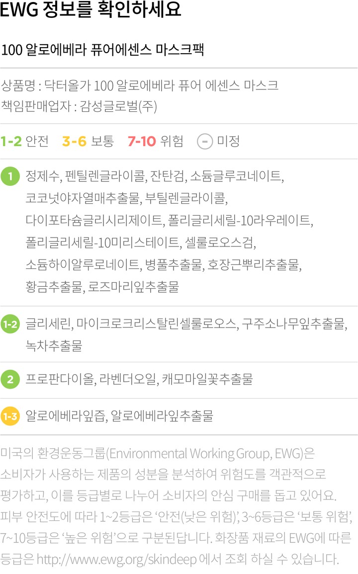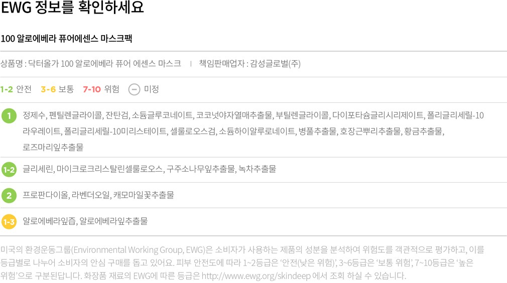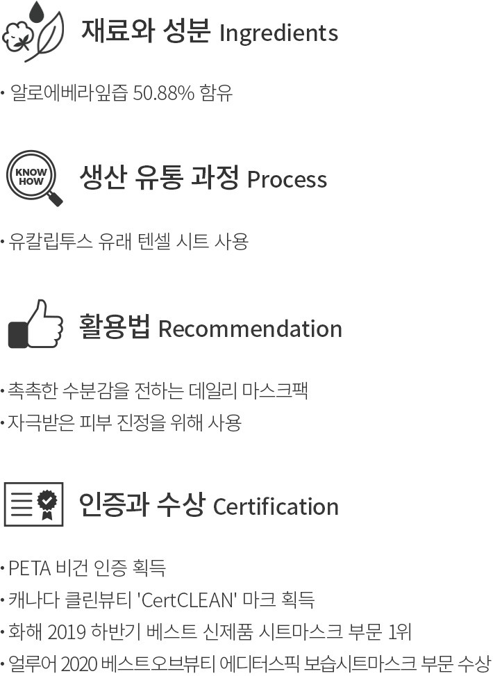 매일 사용하기 좋은 편안한 사용감의 마스크팩을 찾으셨던 분들께 닥터올가를 소개할게요. 100 알로에베라 퓨어에센스 마스크팩은 알로에베라잎즙을 50% 이상 함유해 자극받은 피부를 다독여주고,피부에 촉촉한 수분감을 선사합니다. 에센스만큼이나 피부에 닿는 시트도 중요한데요. 유칼립투스 유래 텐셀 시트는 적당히 도톰한 편이라 에센스를 잘 머금고 있고 밀착력도 높아요.