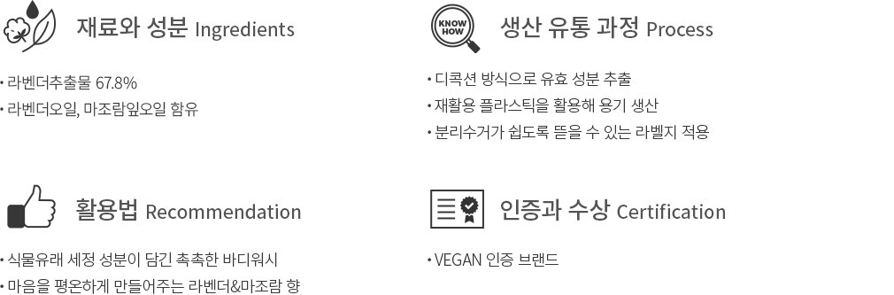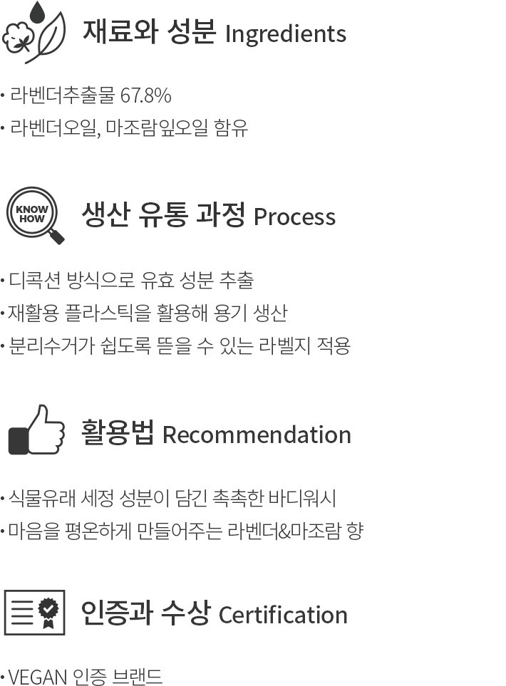 ・향:마음을 차분하게 만들어주는 라벤더와 마조람 향이 나며,샤워 후에는 잔향이 거의 남지 않아요.