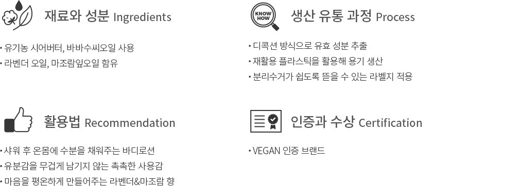 ・특징:건성과 중건성 피부에 적합한 제품으로,유분감이 많이 돌지 않으면서도 촉촉한 보습력을 지닌 바디로션을 찾는 분께 추천해요.
