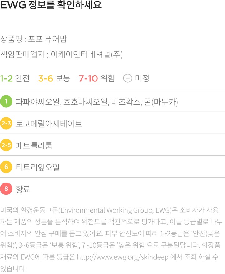 EWG에 대한 컬리의 생각 컬리는 화장품,샴푸,치약,세제 등 우리의 인체에 닿는 리빙 제품의 전성분을 공개하고 성분의 위험 정도를 EWG 기준에 따라 1~10 숫자로 안내하고 있습니다. EWG가 세계적으로 널리 사용되는 신뢰할 수 있는 척도인 것은 맞지만,상품의 안전성을 증명하는 절대적인 기준은 아니에요. EWG로부터 좋지 못한 평가를 받은 성분에 대해 전문가와 유관기관은 '권고 기준치를 지켜 사용할 경우 무해하다'고 평가하기도 합니다. 이에 컬리는 EWG 등급과 인터넷에 떠도는 단편적인 정보에만 의존하지 않고 식품의약품안전처,에코서트(ECOCERT),미국식품의약국(FDA),미국화장품원료검토위원회(CIR)등 공신력 있는 인증기관의 의견을 참고하여 유해성 여부를 꼼꼼하게 따져 보고 있습니다.