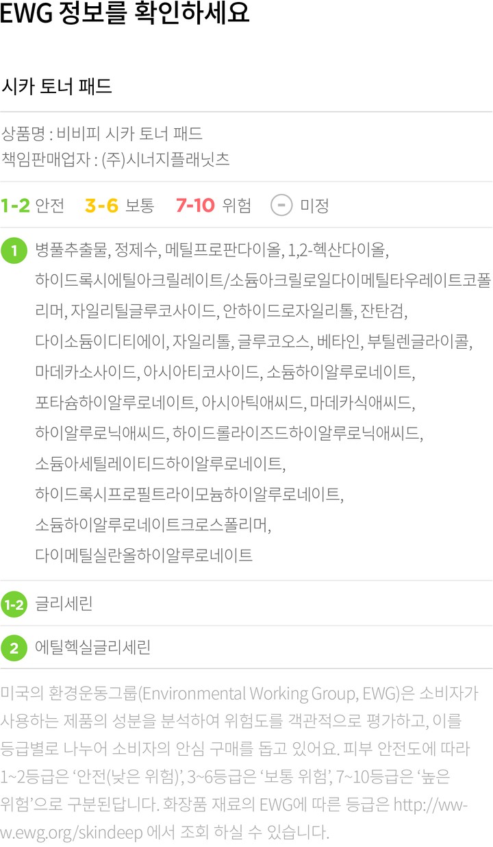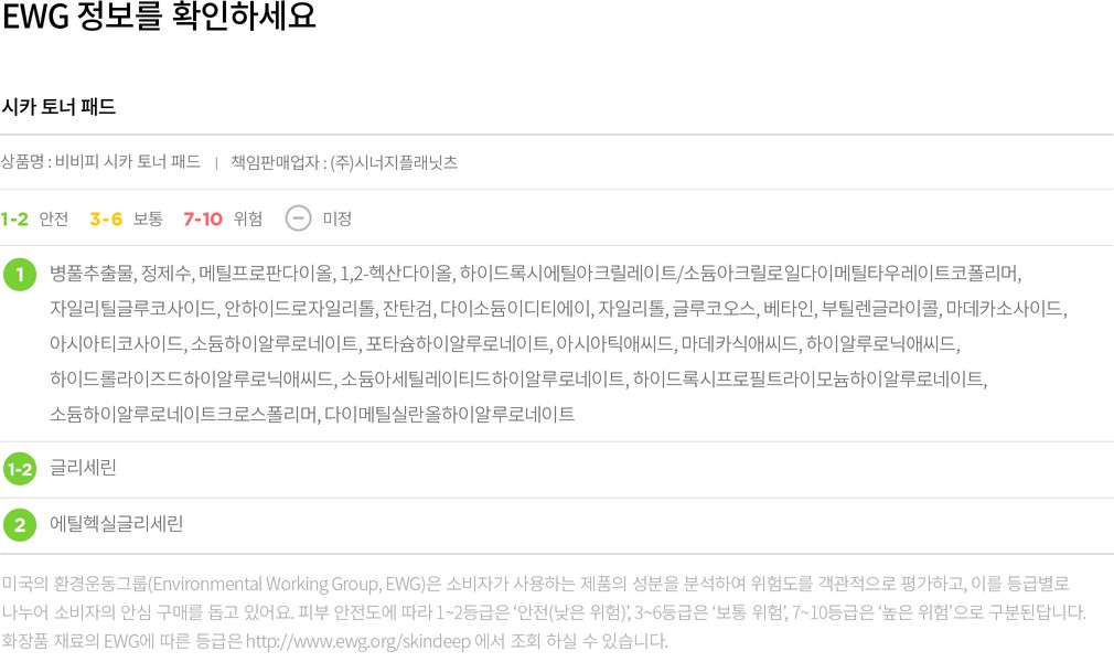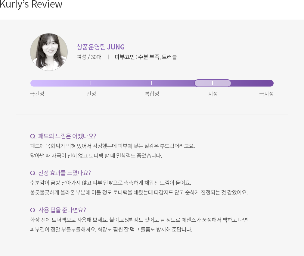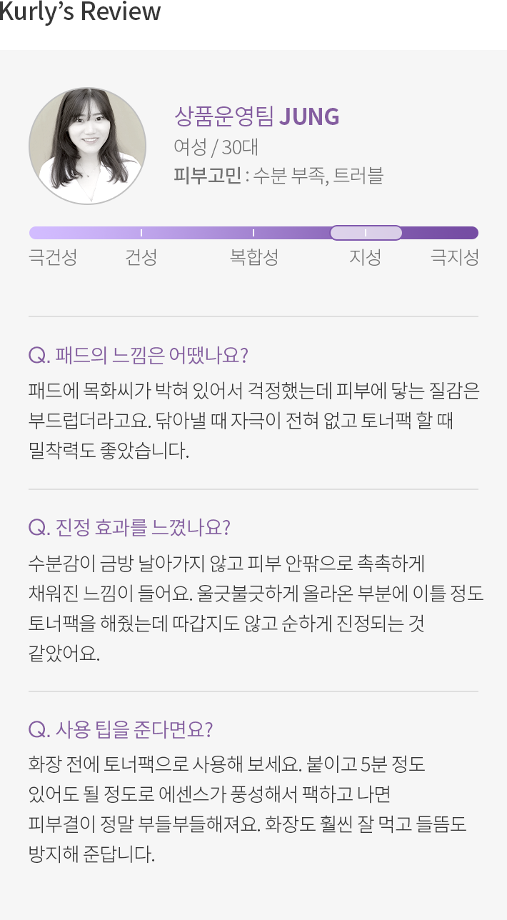 ・특징:데일리로 사용하기 좋은 순한 토너 패드예요. 시카 에센스가 가득 적셔져 있어 한 장으로도 얼굴 전체를 보습하기에 충분해요.