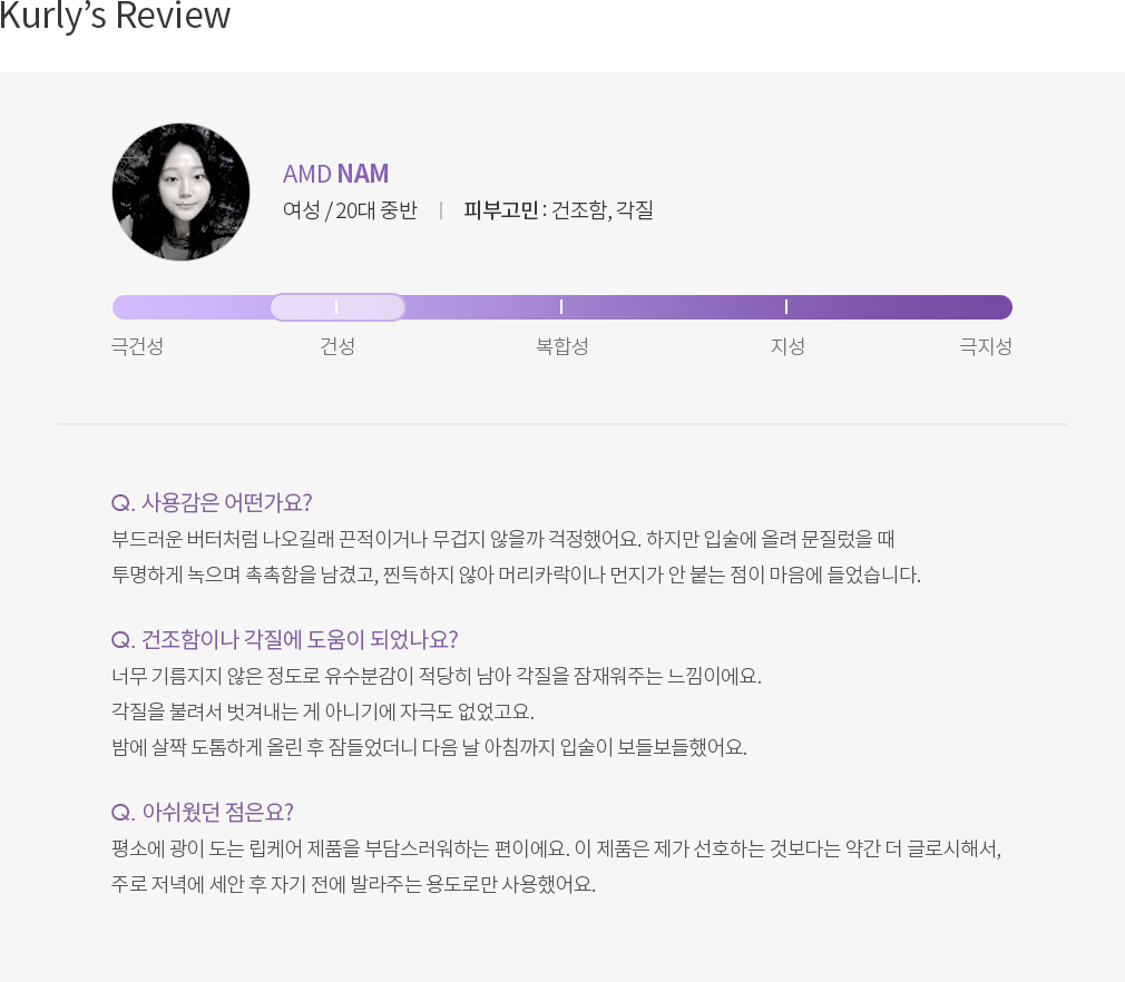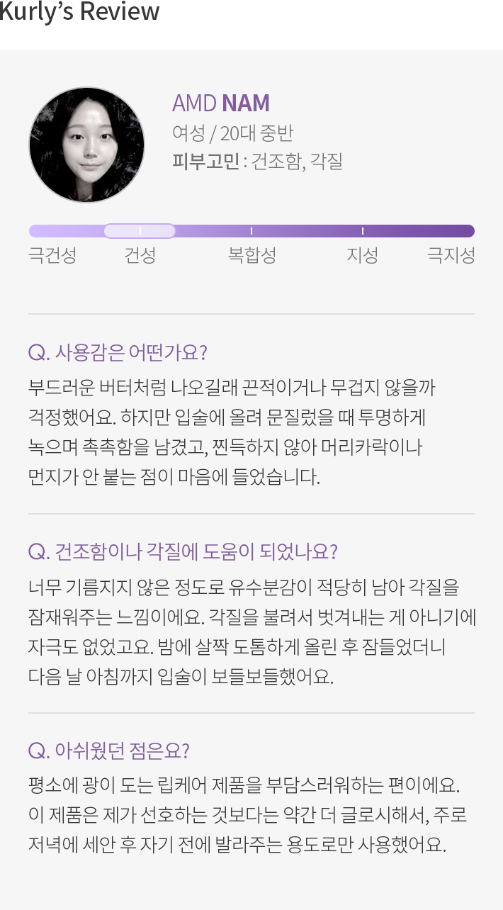 ・특징:각질을 불려서 제거하는 제품이 아니라 자극감이 없고,입술에 촉촉한 막을 씌워주기에 평소 건조함이나 각질이 고민인 분이 사용하기에 좋아요.