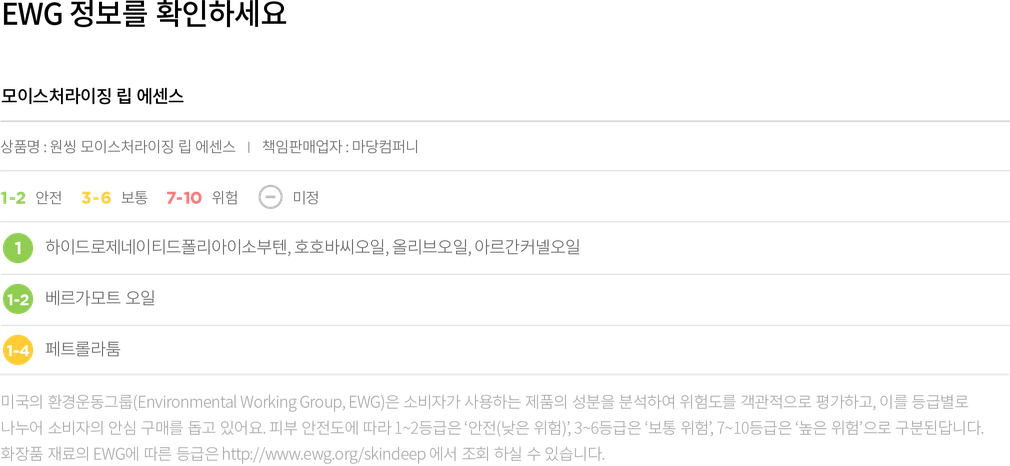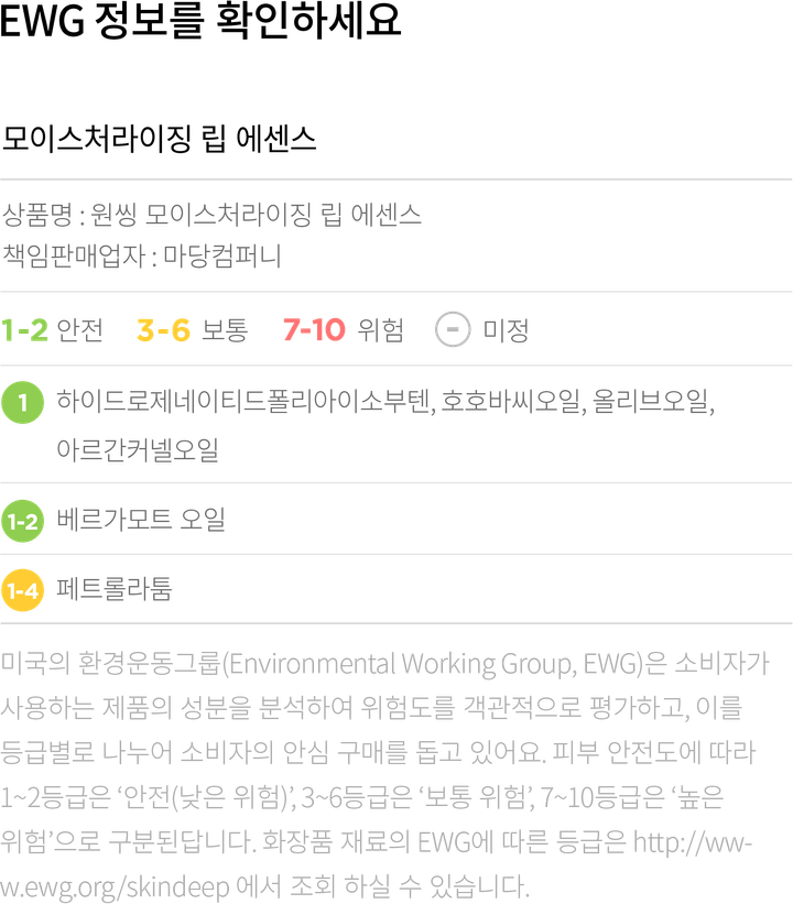컬리는 EWG로부터 보통,위험 등급을 받은 성분이라 하더라도 숨기지 않고 정직하게 공개합니다. 더불어 우려되는 성분에 대한 정보를 함께 제공해 드리오니 구입 전 반드시 확인해 주세요.