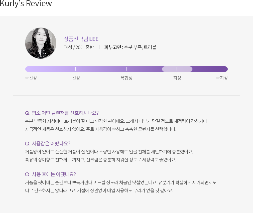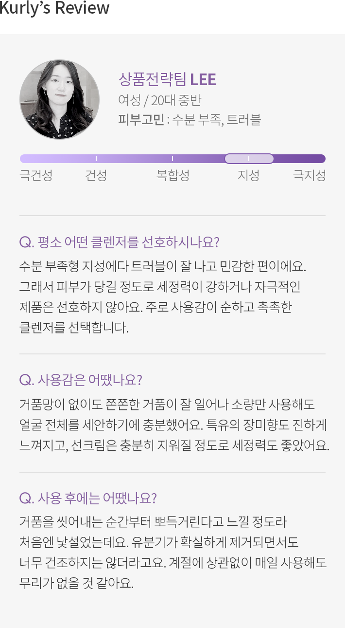 ・특징:사용 후 보습막을 형성해 수분 증발을 막고,유분은 걷어주는 크림 타입 클렌저입니다.