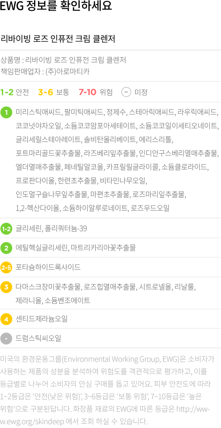 컬리는 EWG로부터 보통,위험 등급을 받은 성분이라 하더라도 숨기지 않고 정직하게 공개합니다. 더불어 우려되는 성분에 대한 정보를 함께 제공해 드리오니 구입 전 반드시 확인해 주세요.