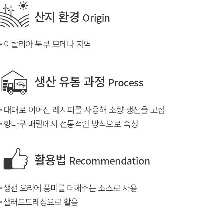 포도 함량이 높아 깔끔하고 새콤한 풍미를 자랑하는 화이트 발사믹을 소개할게요. 이탈리아에서 전통적인 수제 방식을 고집하는 라베키아가 청포도 원액과 와인식초만을 혼합하여 숙성해 만들었답니다. 트레이트마크인 접힌 라벨지마저 멋스럽죠. 생선 마리네이드용으로도 활용하거나,그대로 샐러드드레싱으로 뿌려서 요리의 완성도를 높여 보세요. 올리브오일과 다른 향신료를 더해 나만의 드레싱을 만들어봐도 좋아요.