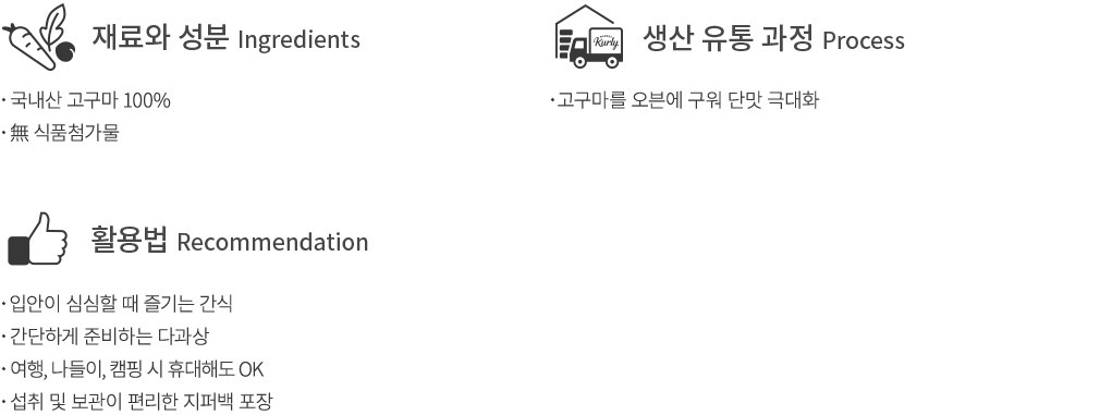 유의사항?제품 표면에 묻어있는 하얀 가루는 흘러나온 당분이 굳은 것으로,고구마 고유의 성분이니 안심하고 섭취하세요.