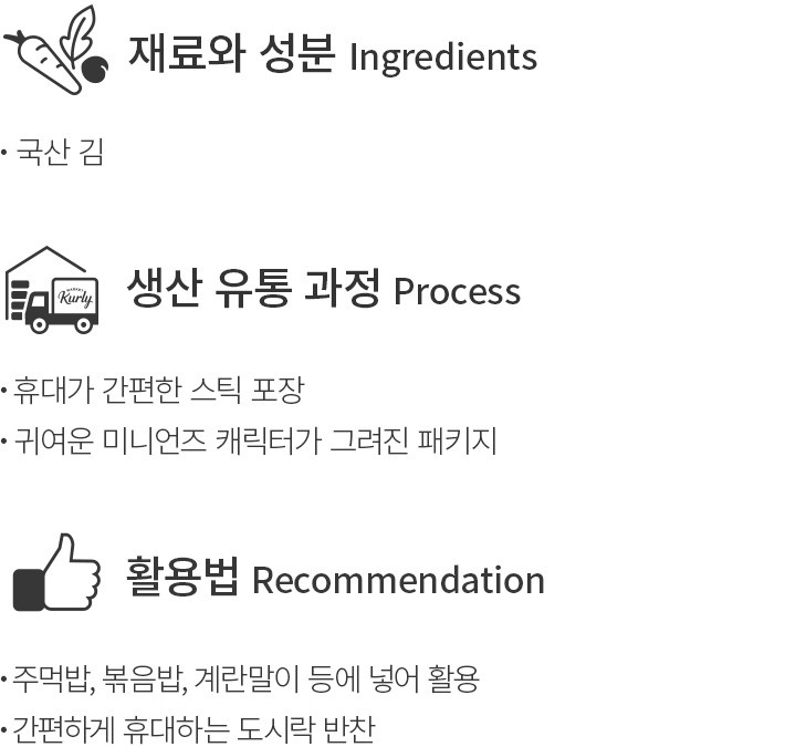 ・활용팁:밥에 김자반을 넣어 조물조물 뭉쳐주면 손쉽게 맛있는 주먹밥을 만들 수 있어요. 계란말이의 속 재료나 잔치국수의 고명으로도 활용해 보세요.