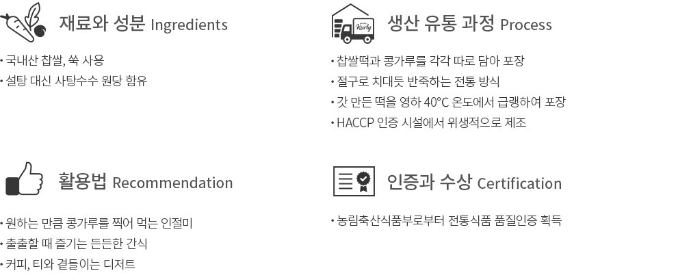・특징:밥 알갱이의 식감을 느낄 수 있는 밥알찹쌀떡과 콩가루를 각각 따로 포장하여 한 팩에 담은 제품이에요.