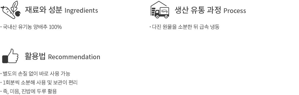 ・특징:잘게 다져낸 국내산 유기농 양배추를 1회분씩 소분해 총 6개로 나눠 담았어요. 깔끔한 큐브 형태라 하나씩 꺼내 쓰기 편리합니다.