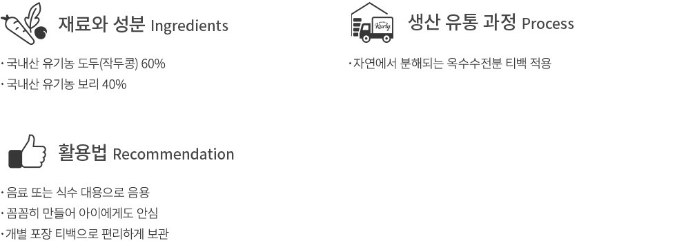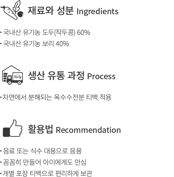 아이가 마실 차라면 원료부터 티백까지 꼼꼼하게 살펴야 하죠. 건강하게 키워낸 유기농 원료를 담아 더욱 믿고 먹을 수 있는 샘표의 순작 우리아이 첫 작두콩차를 만나 보세요. 국내산 유기농 작두콩과 보리만을 사용했어요. 보리를 담고 있는 티백은 옥수수전분으로 만들어져 고온에서 끓여내도 안심이랍니다. 순하고 고소한 순작 작두콩차로 우리 아이를 위한 물을 준비해 보세요.