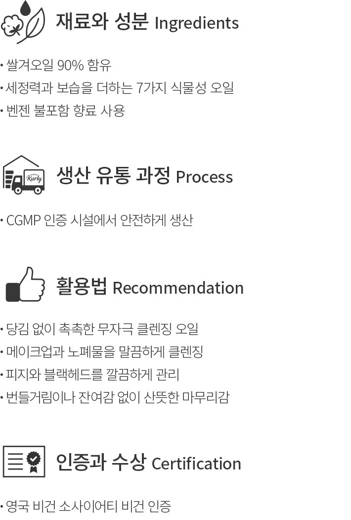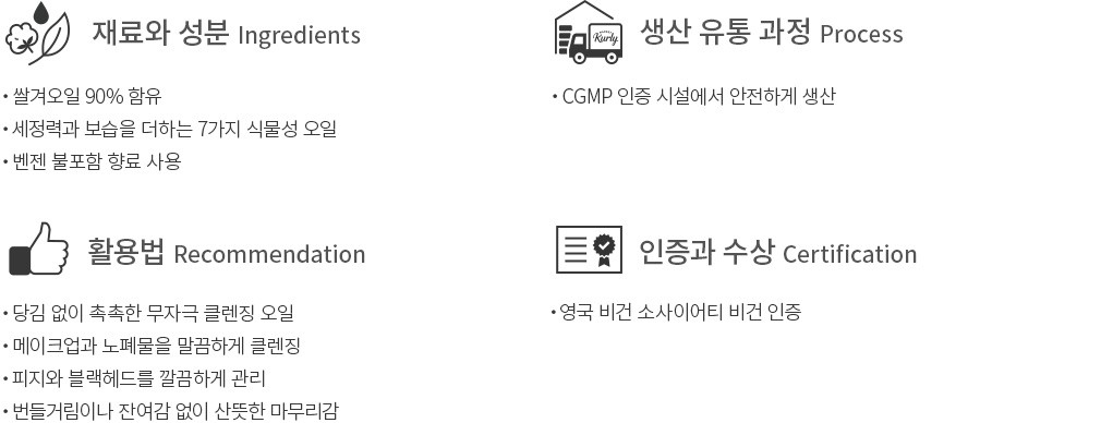 번들거림이나 잔여감 등으로 인해 클렌징 오일을 사용하기 꺼려졌다면 보나쥬르의 제품을 주목해주세요. 쌀겨오일을 90% 함유해 당김 없이 촉촉하면서도 마무리감은 산뜻하고요. 7가지 식물성 오일이 메이크업과 노폐물은 말끔하게 클렌징해줍니다. 식물 유래 성분 위주로 순하게 완성한 무자극 제품이니 민감한 피부도 안심하고 사용해보세요. 동물 유래 성분을 사용하거나 동물 실험을 하지 않은 비건 제품인 점도 마음에 들어요.