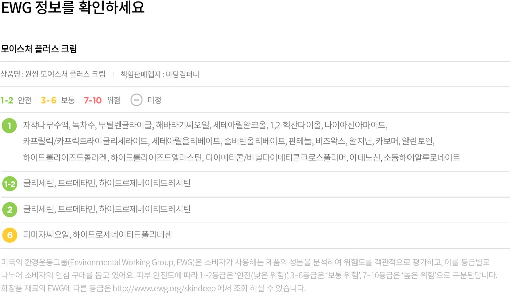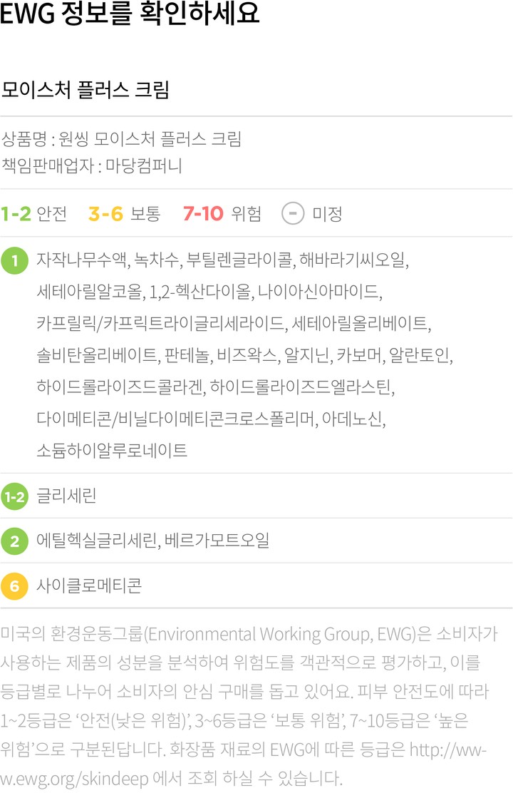 컬리는 EWG로부터 보통,위험 등급을 받은 성분이라 하더라도 숨기지 않고 정직하게 공개합니다. 더불어 우려되는 성분에 대한 정보를 함께 제공해 드리오니 구입 전 반드시 확인해 주세요.