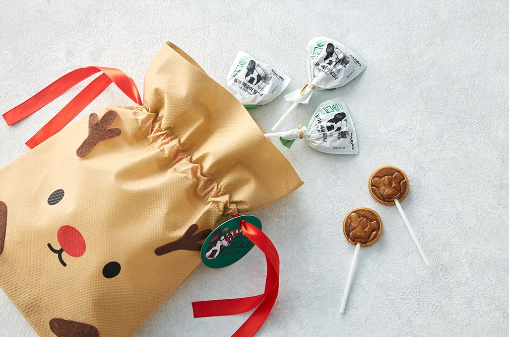 ・특징:유기농 재료로 만든 달고나 12개를 루돌프 그림이 그려진 귀여운 보따리에 담았어요.