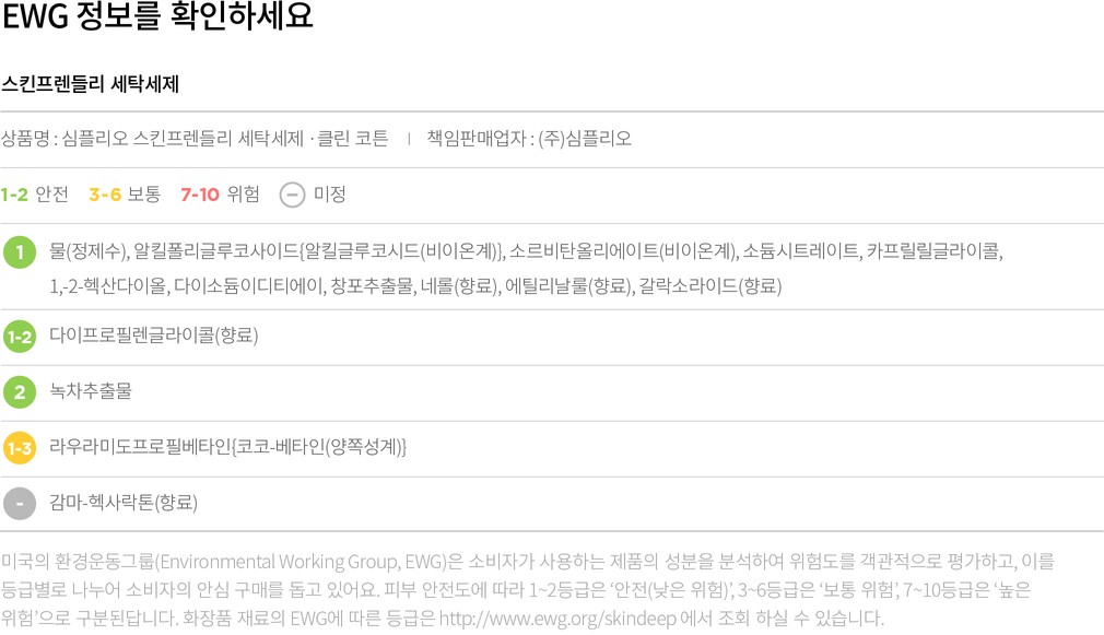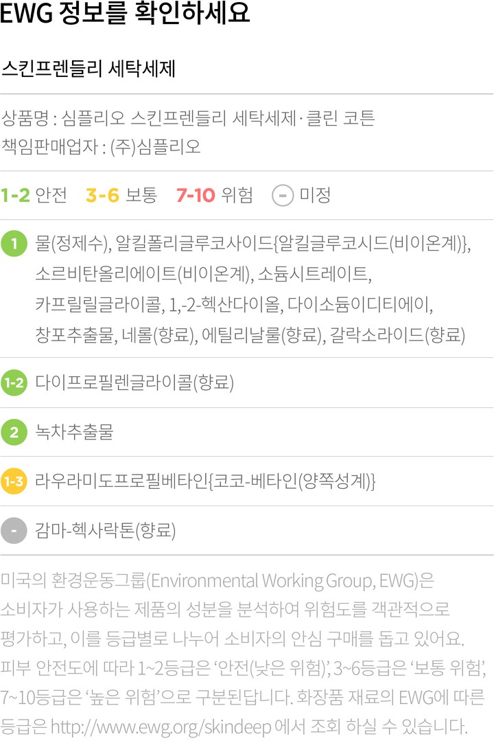 EWG에 대한 컬리의 생각 컬리는 화장품,샴푸,치약,세제 등 우리의 인체에 닿는 리빙 제품의 전성분을 공개하고 성분의 위험 정도를 EWG 기준에 따라 1~10 숫자로 안내하고 있습니다. EWG가 세계적으로 널리 사용되는 신뢰할 수 있는 척도인 것은 맞지만,상품의 안전성을 증명하는 절대적인 기준은 아니에요. EWG로부터 좋지 못한 평가를 받은 성분에 대해 전문가와 유관기관은 '권고 기준치를 지켜 사용할 경우 무해하다'고 평가하기도 합니다. 이에 컬리는 EWG 등급과 인터넷에 떠도는 단편적인 정보에만 의존하지 않고 식품의약품안전처,에코서트(ECOCERT),미국식품의약국(FDA),미국화장품원료검토위원회(CIR)등 공신력 있는 인증기관의 의견을 참고하여 유해성 여부를 꼼꼼하게 따져 보고 있습니다.