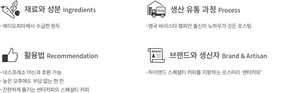 전 세계 커피 생산량의 7%를 차지하는 스페셜티 커피. 센터커피는 그중에서도 더욱 특별한 하이엔드 스페셜티 커피를 지향해요. 세계 각국을 오가며 좋은 원두를 찾는 로스터의 열정을 한잔의 커피에 담아내고자 하죠. 이번에 만나 볼 디카페인 캡슐 또한 그러합니다. 워터 프로세스 공법으로 카페인 함량을 줄였지만,원두 고유의 맛과 향은 그대로 보존했지요. 섬세한 미각을 일깨우는 고급스러운 풍미,네스프레소 머신을 사용해 더욱 간편하게 즐겨 보세요.