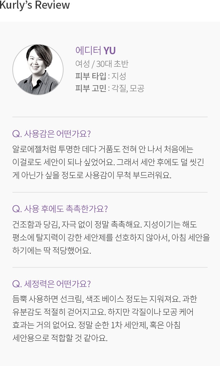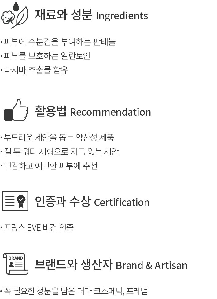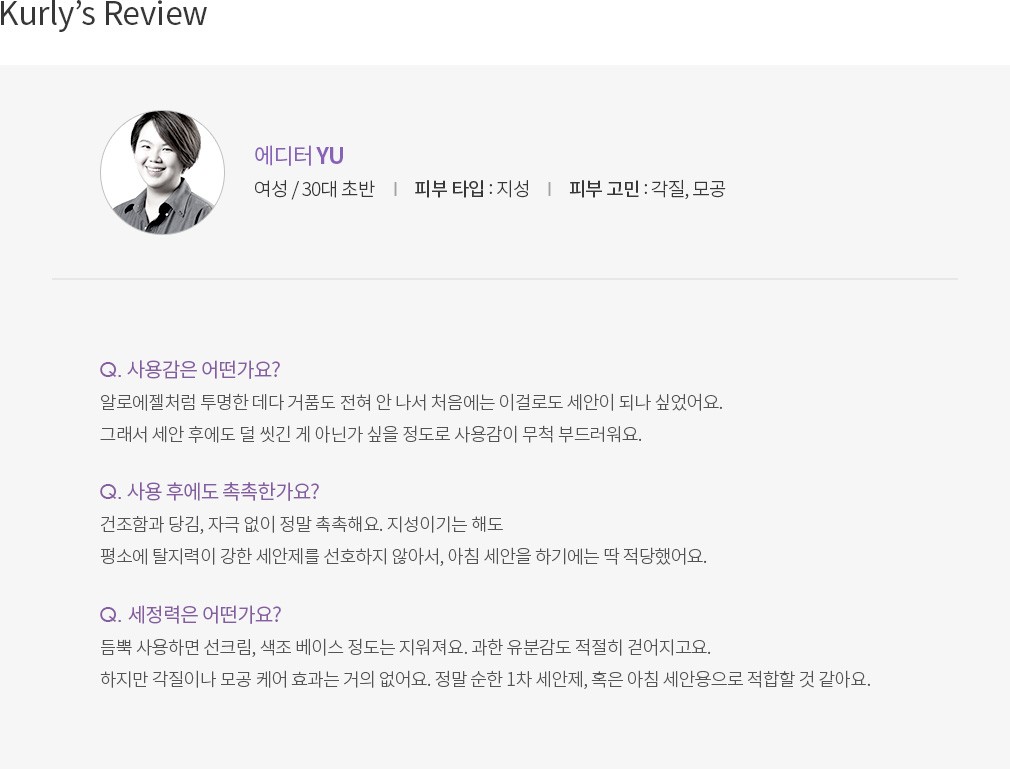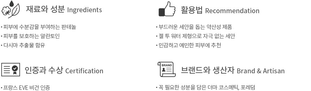 ・특징:거품이 나지 않는 논포밍 제품으로,세안 시의 자극을 최소화한 약산성 클렌저예요.