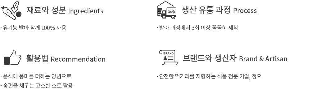 음식에 깨소금을 솔솔 뿌려주면,풍미는 물론 먹음직스러운 모양새까지 한결 살아나지요. 청오의 유기농 발아 깨소금으로 매일의 요리에 고소한 포인트를 더해 보세요. 발아과정 중,3회 이상 꼼꼼하게 세척한 유기농 발아 참깨만을 사용했어요. 한차례 볶아준 뒤에 제법 큼직하게 빻아 더욱 진한 맛과 향을 자랑한답니다. 주방 한 켠에 구비해 두고,나물 반찬이나 비빔밥 등의 요리에 두루 활용해 보세요.