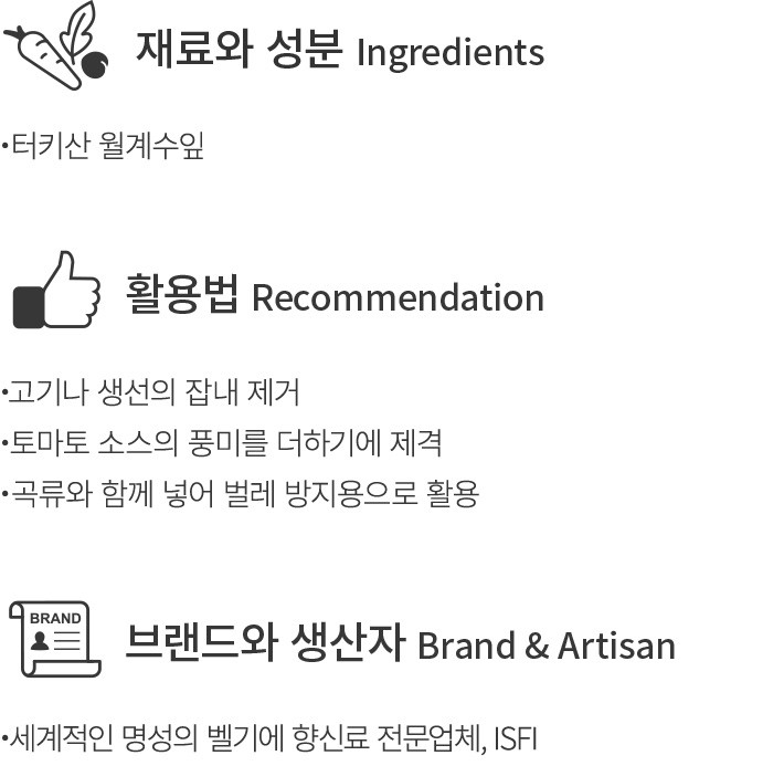 ?특징:건조한 월계수잎을 한 병에 담은 소용량 제품이에요. 입맛을 돋우는 알싸하고 우아한 풍미를 지녔어요.