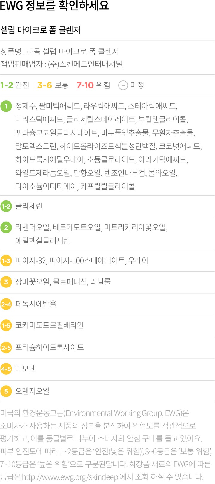 EWG에 대한 컬리의 생각 컬리는 화장품,샴푸,치약,세제 등 우리의 인체에 닿는 리빙 제품의 전성분을 공개하고 성분의 위험 정도를 EWG 기준에 따라 1~10 숫자로 안내하고 있습니다. EWG가 세계적으로 널리 사용되는 신뢰할 수 있는 척도인 것은 맞지만,상품의 안전성을 증명하는 절대적인 기준은 아니에요. EWG로부터 좋지 못한 평가를 받은 성분에 대해 전문가와 유관기관은 '권고 기준치를 지켜 사용할 경우 무해하다'고 평가하기도 합니다. 이에 컬리는 EWG 등급과 인터넷에 떠도는 단편적인 정보에만 의존하지 않고 식품의약품안전처,에코서트(ECOCERT),미국식품의약국(FDA),미국화장품원료검토위원회(CIR)등 공신력 있는 인증기관의 의견을 참고하여 유해성 여부를 꼼꼼하게 따져 보고 있습니다.