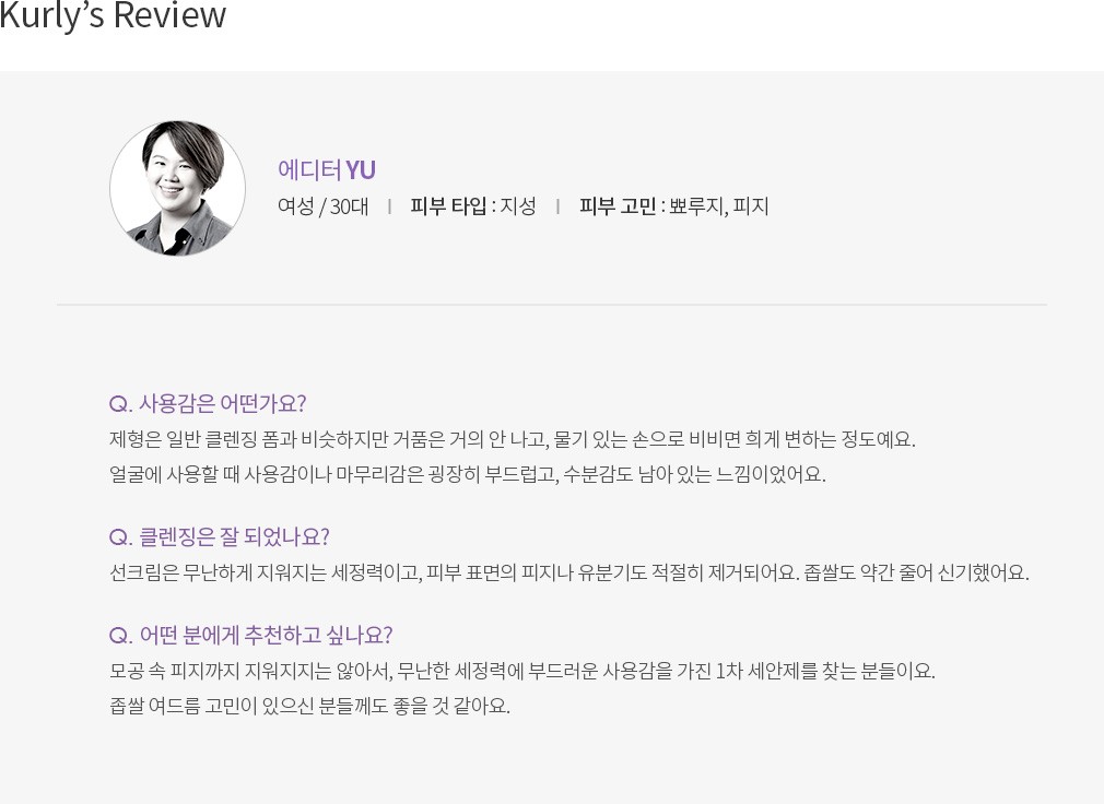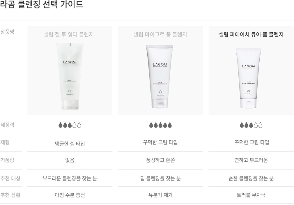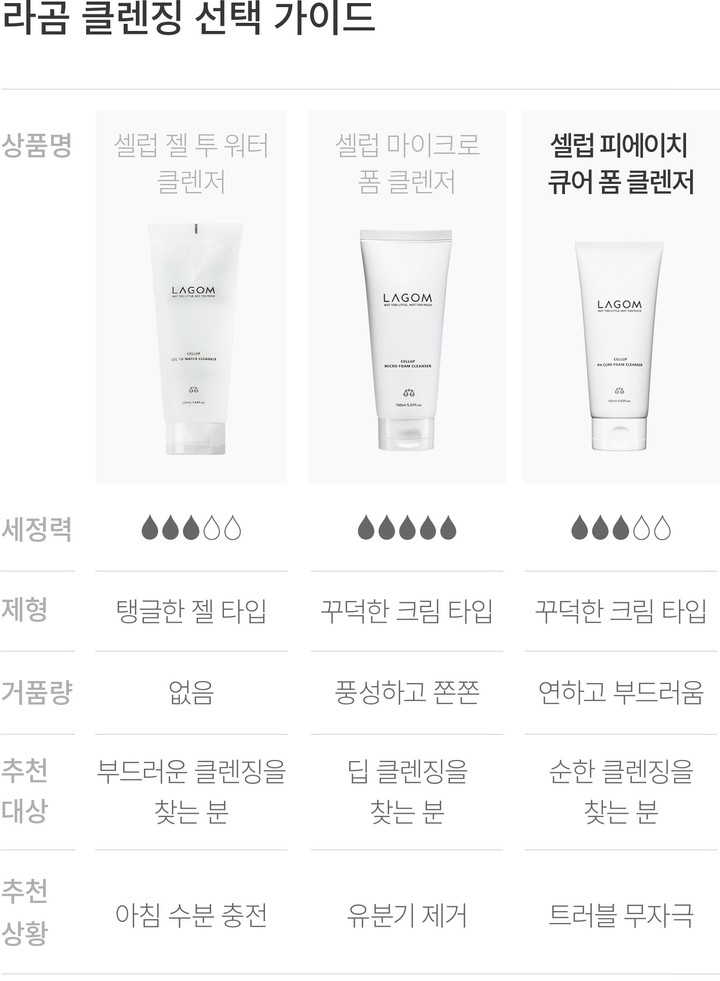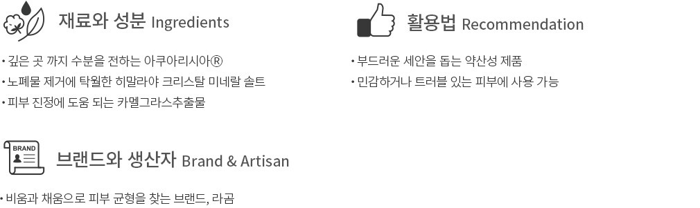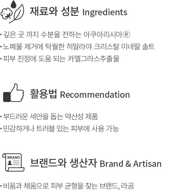 건강한 피부의 산성도는 약 pH 5.5 정도를 웃돈다고 하는데요. 민감한 피부는 pH 지수가 높아 약산성 클렌저를 사용해 수치를 맞춰 주는 게 필요하죠. 이를 위해 라곰은 연약한 피부도 사용할 수 있는 약산성 클렌저를 준비했어요. 히말라야 솔트의 미세한 입자가 피부 사이사이 노폐물을 씻어주고요. 몽글한 거품은 순한 사용감을 선사하니 트러블을 고민하는 민감한 피부도 사용하기 좋을 거예요.