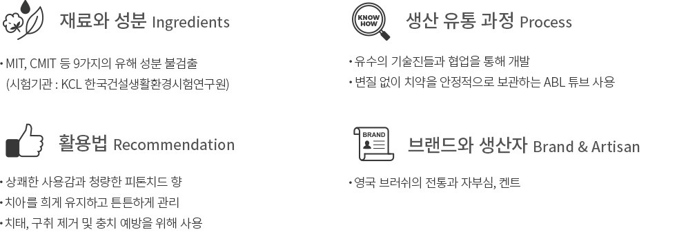 240년이 넘는 역사를 가진 켄트는 부드럽고 우수한 사용감의 칫솔로 많은 사랑을 받고 있죠. 지금 소개하는 제품은 유수의 기술진들과 협업을 통해 탄생한 켄트의 오리지널 치약입니다. 불소를 990ppm 함유해 충치 예방에 도움을 주는 것은 물론이고요. 치아를 희게 유지해주고 튼튼하게 관리해줍니다. 청량한 피톤치드 향과 시원하고 상쾌한 마무리감이 마음에 들어요.