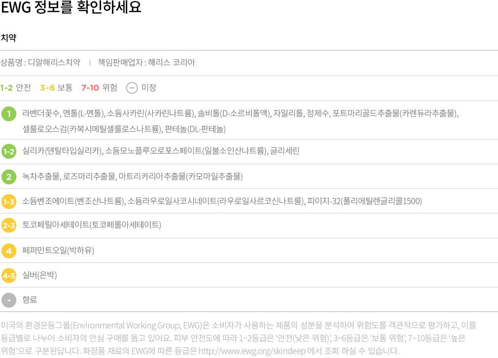 EWG에 대한 컬리의 생각 컬리는 화장품,샴푸,치약,세제 등 우리의 인체에 닿는 리빙 제품의 전성분을 공개하고 성분의 위험 정도를 EWG 기준에 따라 1~10 숫자로 안내하고 있습니다. EWG가 세계적으로 널리 사용되는 신뢰할 수 있는 척도인 것은 맞지만,상품의 안전성을 증명하는 절대적인 기준은 아니에요. EWG로부터 좋지 못한 평가를 받은 성분에 대해 전문가와 유관기관은 '권고 기준치를 지켜 사용할 경우 무해하다'고 평가하기도 합니다. 이에 컬리는 EWG 등급과 인터넷에 떠도는 단편적인 정보에만 의존하지 않고 식품의약품안전처,에코서트(ECOCERT),미국식품의약국(FDA),미국화장품원료검토위원회(CIR)등 공신력 있는 인증기관의 의견을 참고하여 유해성 여부를 꼼꼼하게 따져 보고 있습니다.