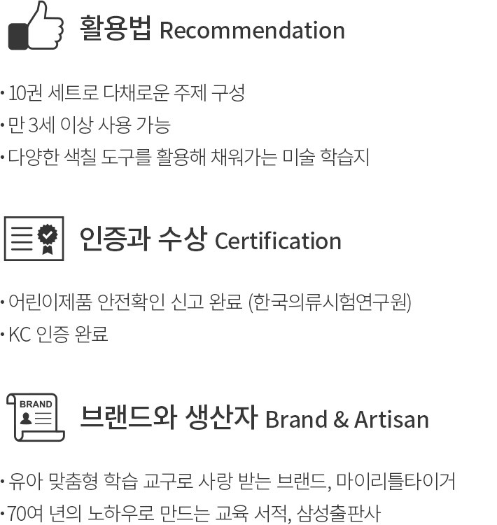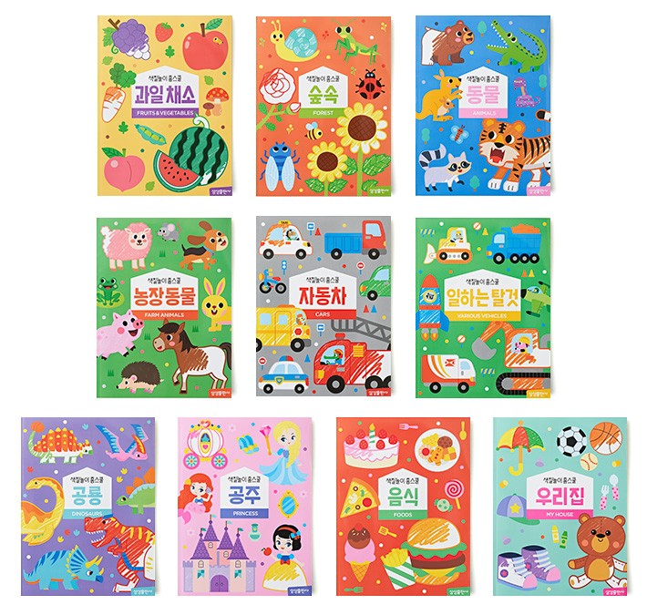 ・특징:과일 채소부터 우리집까지 10가지 주제가 담긴 세트예요. 권당 32페이지의 분량으로,아이 스스로 색칠놀이책을 완성해나가며 창의력과 집중력을 키울 수 있습니다.