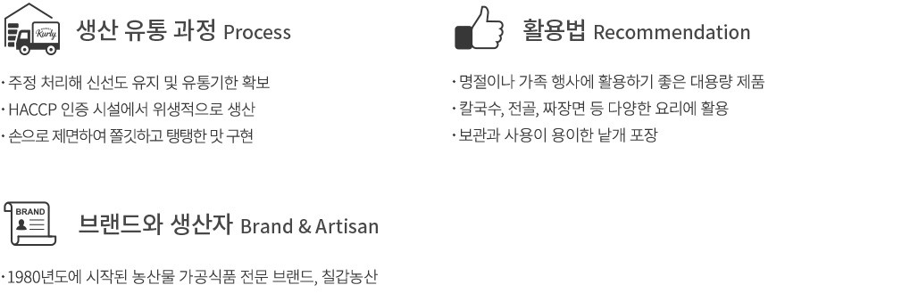 칠갑농산은 충남 청양군 칠갑산 자락에 위치한 농산물 가공식품 브랜드예요. 40여 년의 전통과 노하우로 각종 면과 떡,간편식 등의 제품을 제조해오고 있지요. 이번에 소개하는 엄마손칼국수는 기계 없이 칼로 제면해서 만든 생면 제품입니다. 면발이 얇고 넓적해서 조리했을 때 식감이 쫄깃하고 국물 맛은 진하게 밴다는 게 특징이에요. 1인분씩 개별 포장한 면을 넉넉하게 5봉 담아 준비했으니,가족 행사나 명절에 간편하게 활용해보세요.
