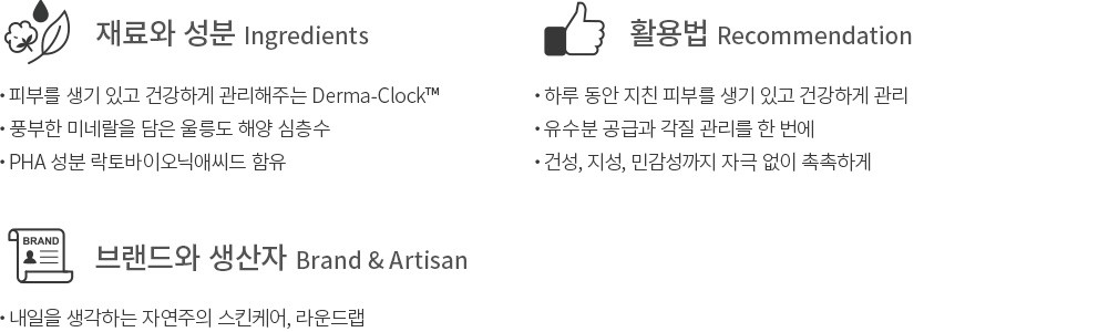 라운드랩은 깨끗한 자연 그대로의 원료에 집중합니다. 사람의 손이 닿지 않는 깊은 바닷속 물과 청량한 숲의 식물들이 그 주인공이죠. 복잡하고 무거운 성분은 내려놓고 꼭 필요한 것들로만 채워 피부에 진정한 휴식을 선사합니다. 또한 독도 시리즈 등의 스토리를 담은 제품 개발을 통해 제품 안에 내일을 생각하는 가치를 담으려 노력하고 있어요. 라운드랩과 함께 피부뿐만 아니라 세상을 변화시킬 수 있는 가치를 실천해 보세요.