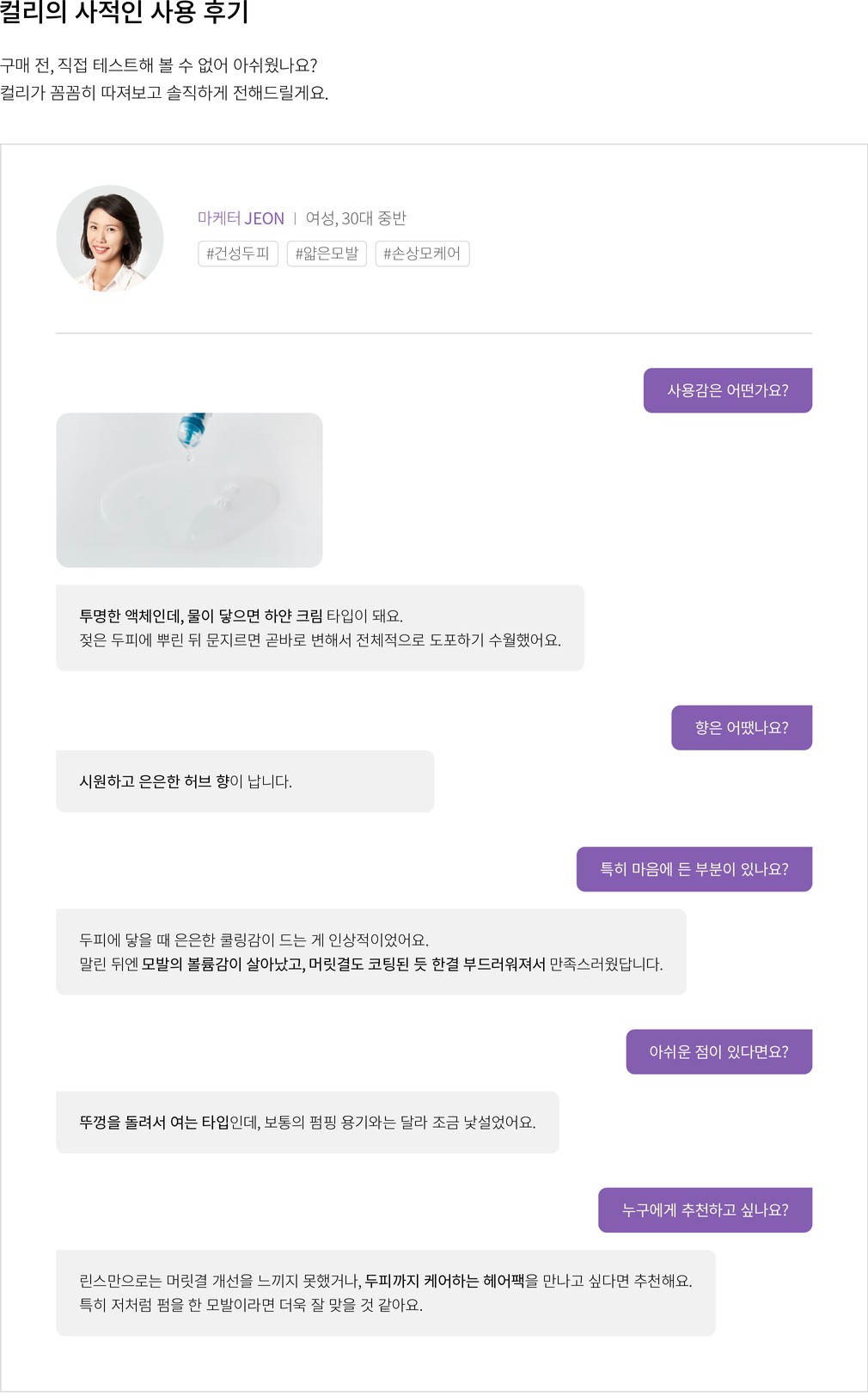・향료:향을 내기 위해 첨가한 성분입니다. 향료가 우려된다면 무향 제품이나 향을 내는 오일이 첨가된 제품을 사용할 수밖에 없습니다.