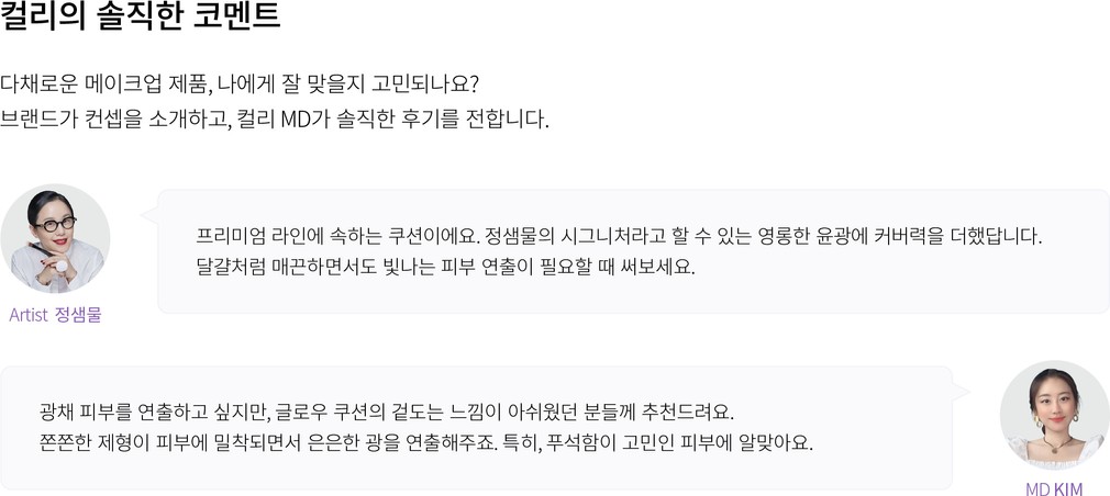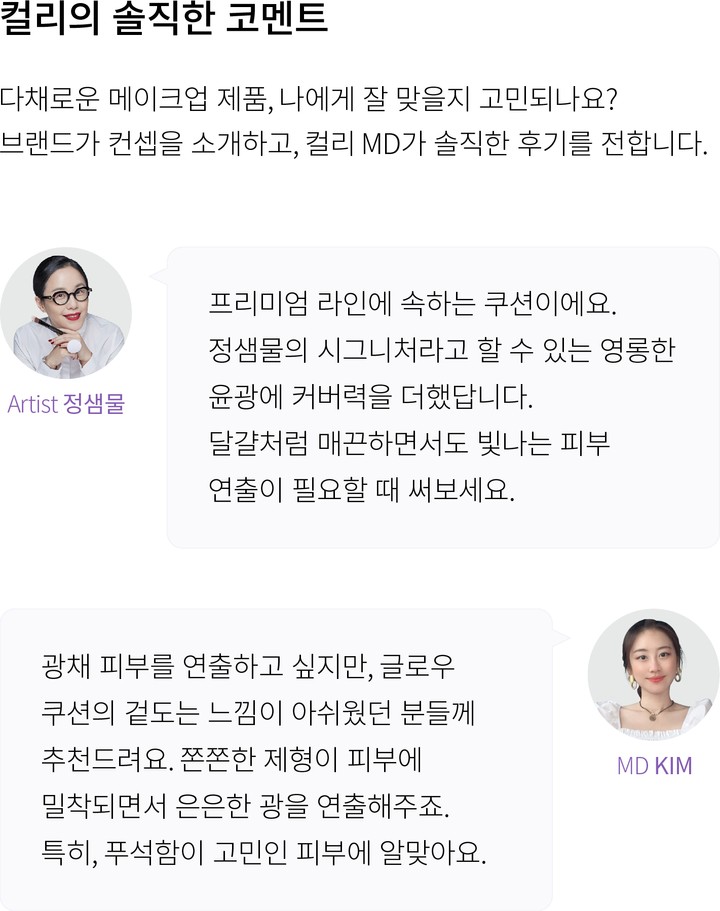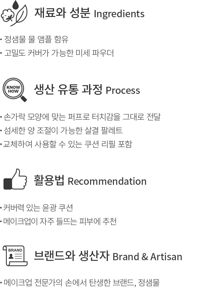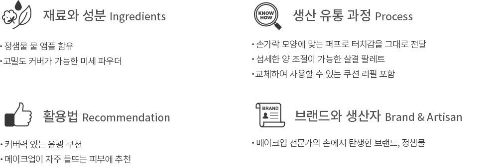 메이크업 아티스트 정샘물의 30년 노하우가 담긴 쿠션을 소개합니다. 이 쿠션은 물 앰플을 담아 시간이 지나도 맑은 광채를 선사하는 제품이에요. 피부 표현뿐만 아니라 미세 파우더로 커버력까지 잡았답니다. 손의 터치감을 그대로 전달하는 퍼프와 커버에 필요한 적당량을 뿜어내는 쿠션 스펀지,섬세한 양조절을 위한 살결 팔레트까지,아티스트의 터치를 느껴보세요.