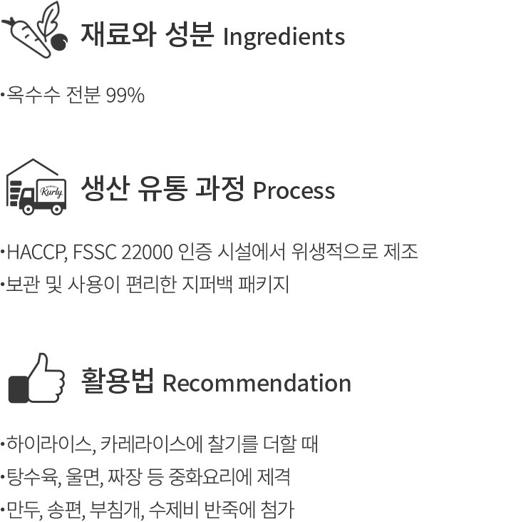 요리에 쫄깃한 식감과 입에 착 감기는 감칠맛을 더해 주는 전분 가루,성진으로 만나보세요. 엄선한 재료로 고품질의 곡물 및 전분 가루를 전문으로 생산하며,이미 국내 여러 기업의 신뢰를 얻은 믿음직한 브랜드랍니다. 이번에 소개할 제품은 접착력이 우수해 반죽에 조금씩 첨가하기 좋은 옥수수 전분입니다. 중화요리 소스에 걸쭉한 질감을 더해줄 때도 활용 가능하고요. 낙지 볶음이나 아귀찜 등 한식에 감칠맛과 윤기를 더해줄 때 역시 톡톡한 역할을 해내지요. 옥수수 전분을 구비해 두면,다양한 요리에 부담 없이 활용하기 좋을 거예요.