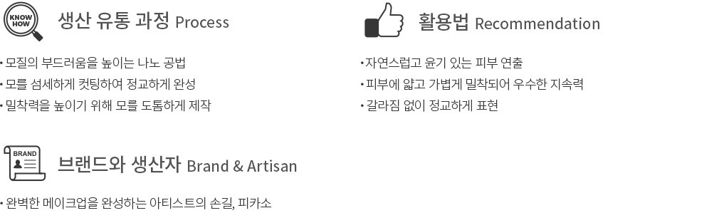 모방할 수 없는 완성도와 내구성 피카소의 브러쉬는 용도에 맞는 고품질의 모를 찾는 것에서 시작합니다. 엄격한 기준으로 선별한 모를 장인들이 직접 섬세하게 컷팅하여 최적의 형태를 완성하고,예민한 피부에도 부드럽게 닿도록 가공하죠. 편안한 그립감과 정교한 컨트롤이 가능하도록 핸들까지 꼼꼼하게 설계하고 견고하게 완성했습니다. 또 일반적인 브러쉬처럼 모근을 당기는 테스트를 하는 대신,모근과 모질 자체를 보호하여 오랫동안 사용할 수 있도록 연구하고 있습니다. 그래서 그 품질과 내구성은 하루에도 수많은 메이크업을 하는 전문가들에게 인정을 받고 있죠.