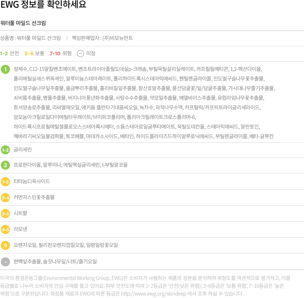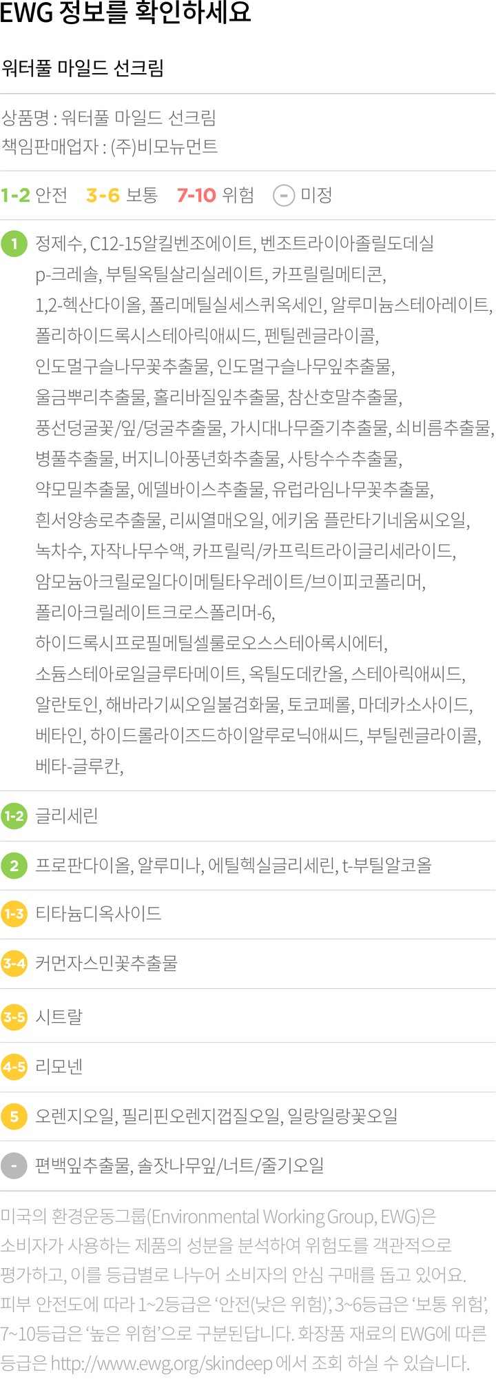 컬리는 EWG로부터 보통,위험 등급을 받은 성분이라 하더라도 숨기지 않고 정직하게 공개합니다. 더불어 우려되는 성분에 대한 정보를 함께 제공해 드리오니 구입 전 반드시 확인해 주세요.