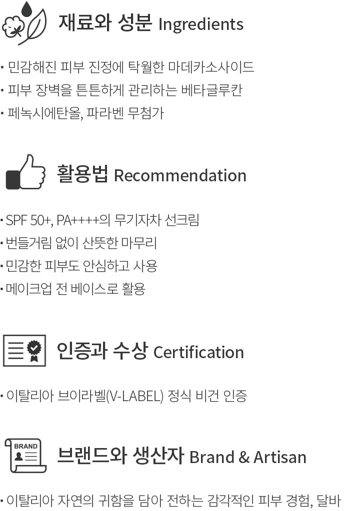 촉촉하게 발리는 순한 무기자차 선크림을 찾았다면 주목해주세요. 컬리는 민감한 피부도 안심하고 사용하는 달바의 워터풀 마일드 선크림을 준비했어요. SPF 50,PA++++의 든든한 자외선 차단력을 갖춘 제품인데요. 그 이름처럼 촉촉한 제형으로 무기자차 특유의 뻑뻑한 발림성을 개선했죠. 사용 후에도 가볍게 밀착되어 번들거림이나 밀림 현상 없이 편안할 거예요. 이탈리아 브이라벨에서 정식 비건 인증을 받은 점도 함께 확인해 보세요.
