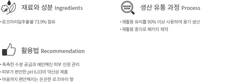 지치고 균형을 잃은 피부를 위해 아로마티카의 바이탈라이징 로즈마리 컨센트레이티드 에센스를 소개할게요. 피부에 부담을 줄일 수 있도록 꼭 필요한 성분만으로 간결하게 완성했어요. 정제수 대신 로즈마리의 건강한 에너지를 가득 담았죠. 건조하고 예민해진 피부에 촉촉한 수분을 전해주고 편안하게 다독여줍니다. 은은한 로즈마리 향과 함께 피부를 건강하게 가꾸어보세요.