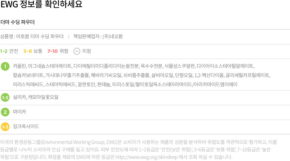 컬리는 EWG로부터 보통,위험 등급을 받은 성분이라 하더라도 숨기지 않고 정직하게 공개합니다. 더불어 우려되는 성분에 대한 정보를 함께 제공해 드리오니 구입 전 반드시 확인해 주세요.